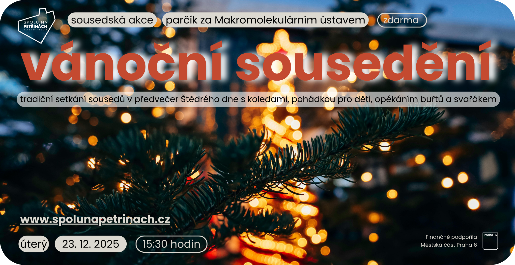 Tradiční setkání sousedů v předvečer Štědrého dne se letos uskuteční v úterý 23.12.2025 v parčíku u ohniště za Makromolekulárním ústavem (Sestupná ulice). Přineste sebou: Pro děti jsou připraveny světelné hry...